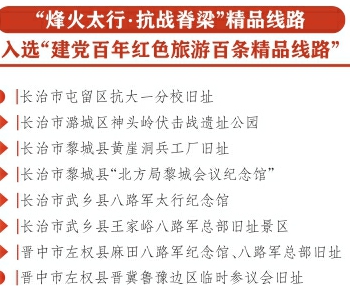 6月1日,文化和旅游部、中央宣傳部、中央黨史和文獻(xiàn)研究院、國家發(fā)展改革委聯(lián)合發(fā)布“建黨百年紅色旅游百條精品線路”,山西3條線路入選。其中,重溫紅色歷史、傳承奮斗精神主題線路,我省入選的是:“烽火太行·抗戰(zhàn)脊梁”精品線路。具體景點(diǎn)為:長治市屯留區(qū)抗大一分校舊址—長治市潞城區(qū)神頭嶺伏擊戰(zhàn)遺址公園—長治市黎城縣黃崖洞兵工廠舊址—長治市黎城縣“北方局黎城會(huì)議紀(jì)念館”—長治市武鄉(xiāng)縣八路軍太行紀(jì)念館—長治市武鄉(xiāng)縣王家峪八路軍總部舊址景區(qū)—晉中市左權(quán)縣麻田八路軍紀(jì)念館、八路軍總部舊址—晉中市左權(quán)縣晉冀魯豫邊區(qū)臨時(shí)參議會(huì)舊址。目前,該主題線路正發(fā)揮著積極作用。左權(quán)縣利用境內(nèi)豐富的紅色資源,將晉冀魯豫邊區(qū)臨時(shí)參議會(huì)舊址、麻田八路軍總部紀(jì)念館、左權(quán)烈士陵園等革命遺址(舊址)開辟為黨史學(xué)習(xí)教育“教室”,紛紛組織廣大黨員、干部及學(xué)校師生到紅色教育基地,重溫入黨誓詞,聆聽革命故事,緬懷革命先烈。截至目前,左權(quán)縣開展黨史學(xué)習(xí)教育650余場(次),覆蓋13264名黨員干部。