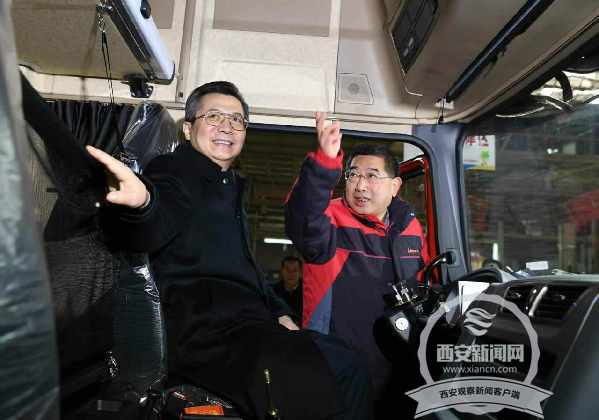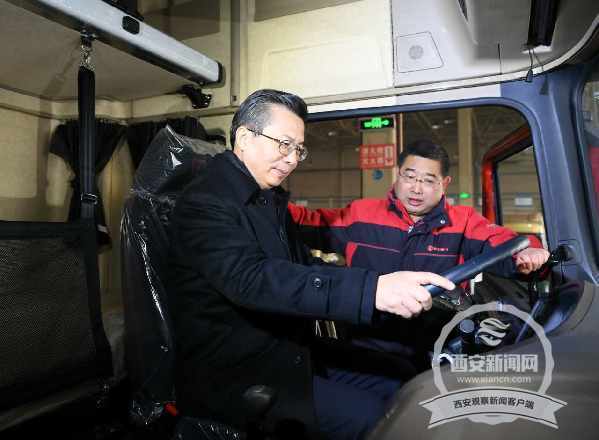 西安市委書記王永康在陜汽集團生產(chǎn)線詳細了解生產(chǎn)銷售、技術研發(fā)、車輛調(diào)試情況,詢問新能源汽車的生產(chǎn)工藝、市場占有率,并饒有興致地登上重卡體驗舒適度 (西安日報 記者 李欣攝)