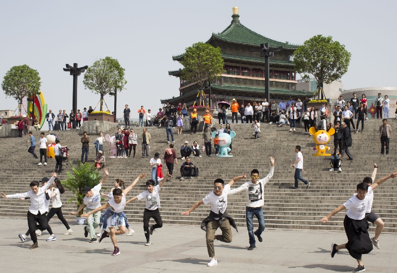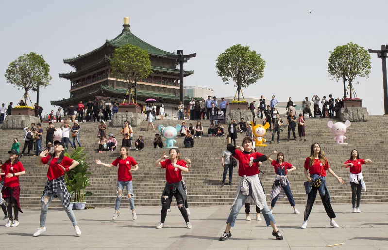 團(tuán)員青年們5月4日下午在鐘鼓樓下沉廣場以“快閃”的方式慶祝五四青年節(jié)。西安晚報(bào)首席記者王健 攝