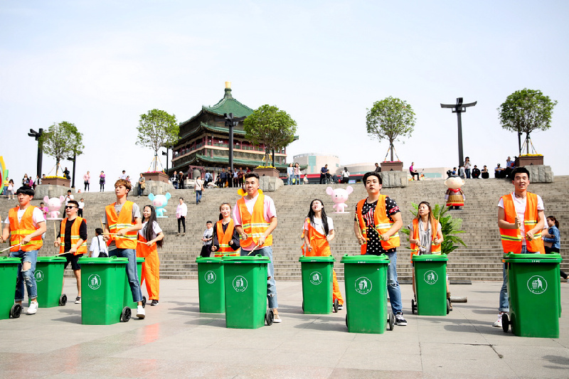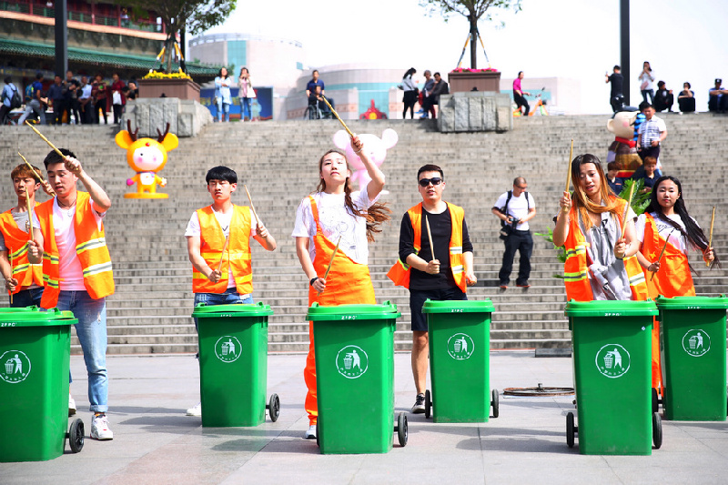 西安新聞網(wǎng)訊(文記者張松)鐘樓金花廣場今日行人如織。突然,十個(gè)綠色的垃圾桶被搬進(jìn)了廣場。圍觀的群眾正在納悶把垃圾桶搬進(jìn)廣場干什么?這時(shí),十名身穿黃色保潔衣服的青年男女,用木棍在垃圾桶上敲打起來,奏響了美妙的樂章。