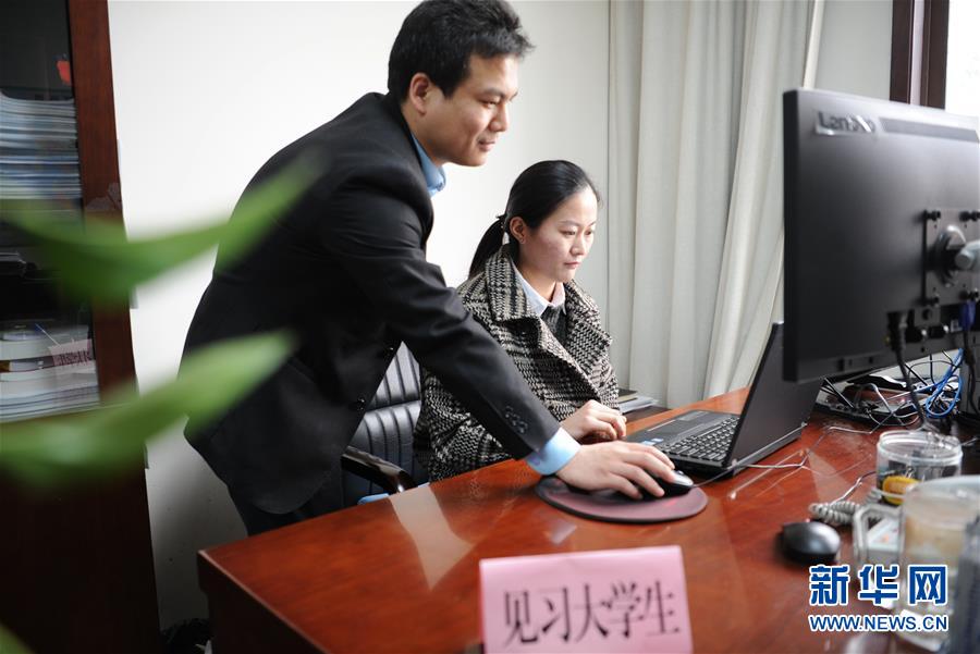 1月22日,陜西師范大學研究生岳攀(右)在接受陜西省政府辦公廳工作人員的培訓指導。 當日,來自17所高校的109名大學生走進陜西省政府大院接受培訓,他們將被分配至40個廳局部門,開始為期39天的“準公務員”見習生活。新華社發(fā)(張博文 攝) -