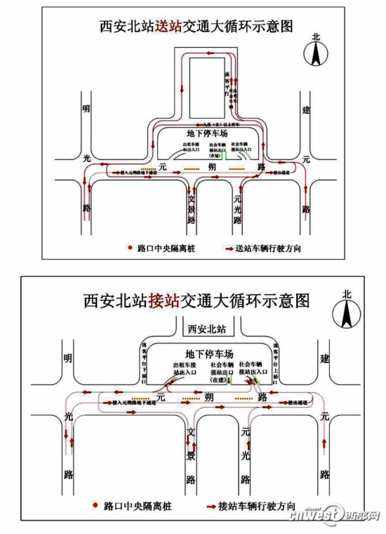 同時在西安北客站外圍制定接送站交通大循環(huán)方案:送站大循環(huán)線路為文景路(明光路、元光路或建元路)→元朔路→落客平臺上橋口→平臺東匝道出發(fā)口→落客平臺下橋口(全部右轉(zhuǎn))→元朔路→明光路離開北客站。