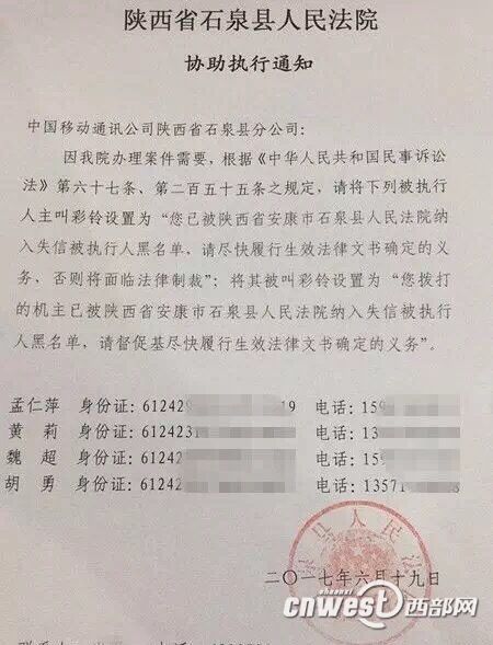 西部網(wǎng)訊(記者李媛 通訊員焦軍 尚君)“您撥打的機(jī)主已被陜西省安康市石泉縣人民法院納入失信被執(zhí)行人黑名單,請督促其盡快履行生效法律文書確定的義務(wù)”。這樣的彩鈴您從來沒聽過吧!今后,這樣的彩鈴您在生活中或許就會遇到。石泉縣人民法院近日被安康市中級人民法院指定為“通信限制”試點(diǎn)法院,分別與石泉縣移動、電信、聯(lián)通三大通信公司協(xié)商一致,將通過發(fā)送《協(xié)助執(zhí)行通知書》的方式請三大通信公司協(xié)助執(zhí)行,在陜西全省率先對“老賴”實施通信限制。