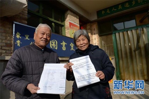雷國平(左)、范秀蓮夫婦在家里創(chuàng)辦的“東里村青少年圖書館”外展示借閱登記冊和圖書捐贈記錄(12月16日攝) 新華社記者 李一博 攝