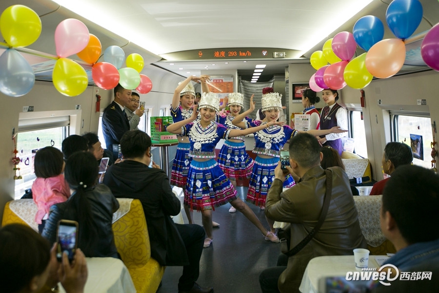 4月1日,西安北至貴陽北的G862次列車上,身穿民族特色服飾的列車工作人員在為旅客表演節(jié)目。(圖/王曙天)