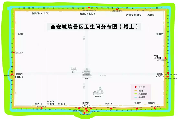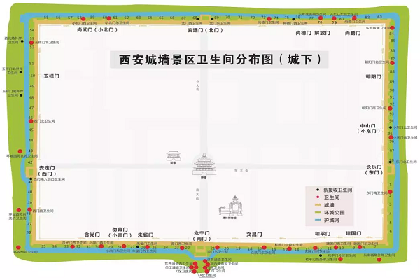 4月24日,為方便市民和游客,西安城墻景區(qū)公布了其范圍內(nèi)64座衛(wèi)生間的具體位置。其中開放式景區(qū)內(nèi)有48座,收費景區(qū)范圍內(nèi)為16座,全部為固定式衛(wèi)生間。