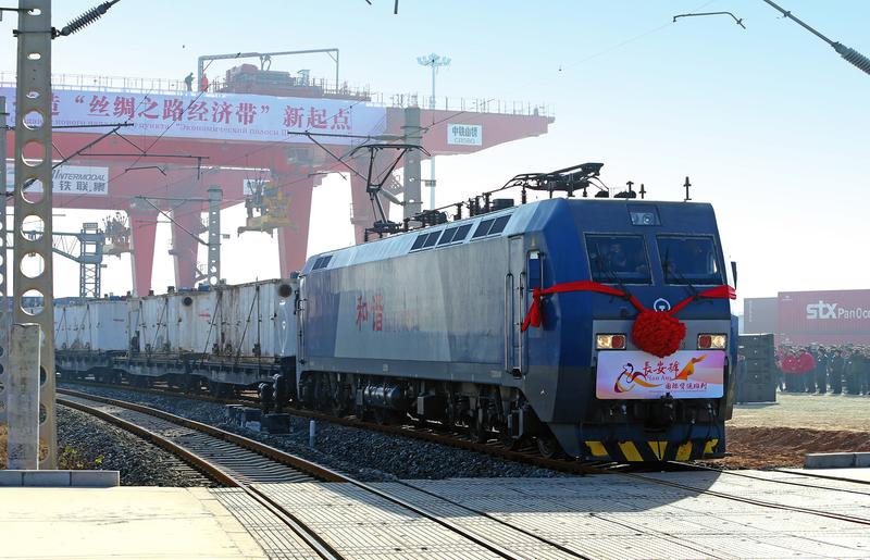 西安—哈薩克斯坦“長安號(hào)”國際貨運(yùn)班列。 陜西日?qǐng)?bào)記者 母家亮攝