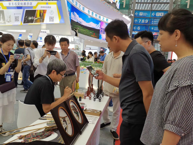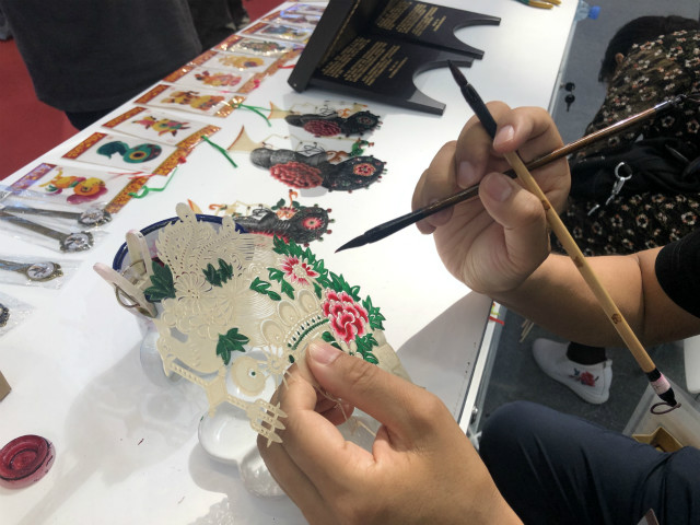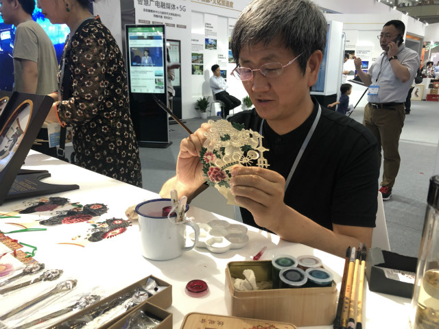 在文博會(huì)陜西展館的入口處,華州皮影制作技藝非遺傳承人薛宏權(quán)正在現(xiàn)場(chǎng)描畫(huà)皮影,嫻熟而獨(dú)特的操作,吸引了不少人駐足觀看。