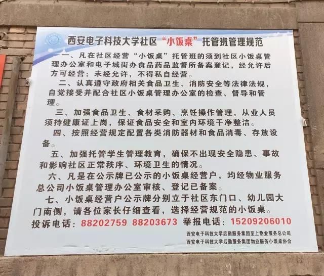 西安電子科技大學社區(qū)內(nèi)托管班招牌上附有“小飯桌登記備案戶”牌匾圖片 圖片來自大秦之聲