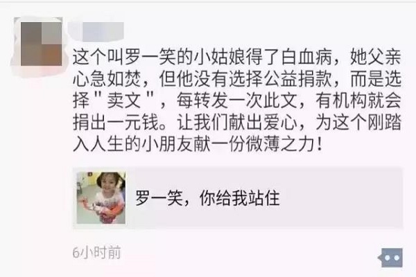 去年一篇題為《羅一笑,你給我站住》的微信文章傳遍朋友圈。文內(nèi)父親羅爾稱5歲女兒羅一笑患白血病,治療費(fèi)用平均每天上萬(wàn)元,急需救命、懇求捐款。此文章在朋友圈瘋傳兩天羅爾獲捐270萬(wàn)元。最終結(jié)局大反轉(zhuǎn)!被查出該文章是羅爾與P2P理財(cái)公司聯(lián)合拋出的營(yíng)銷手段,大眾的同情心、善良被深深刺痛。