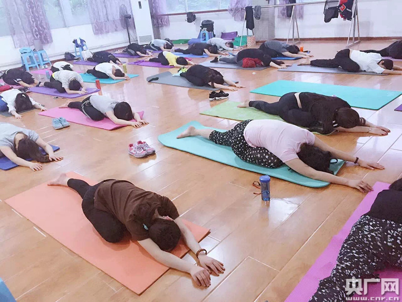 健身房內(nèi)學(xué)員跟隨老師在進行瑜伽課程 圖片來自大秦之聲