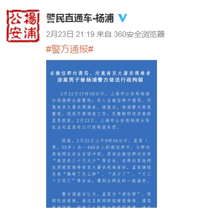 據(jù)上海市公安局楊浦分局官方微博消息,2月22日17時(shí)30分許,上海市公安局楊浦分局接群眾報(bào)警稱:有人在微信群中謾罵、污蔑南京大屠殺遇難者。接報(bào)后,楊浦警方高度重視,迅速開展調(diào)查工作,民警隨即將涉案的孟某抓獲。2月23日,上海市公安局楊浦分局依法對(duì)孟某處以行政拘留處罰。
