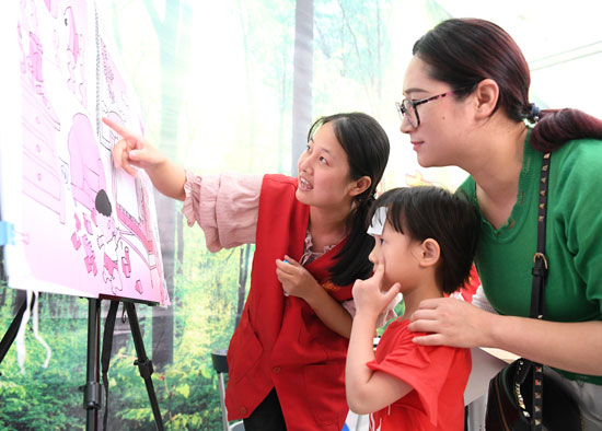 復旦大學附屬兒科醫(yī)院門診大廳內(nèi),志愿者在為患兒做意外傷害預防宣導。孫國根/攝