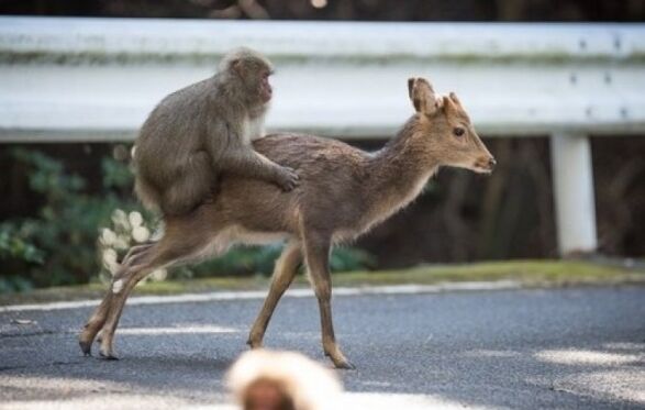 日本獼猴騎鹿四處走 “稱霸”神秘屋久島
