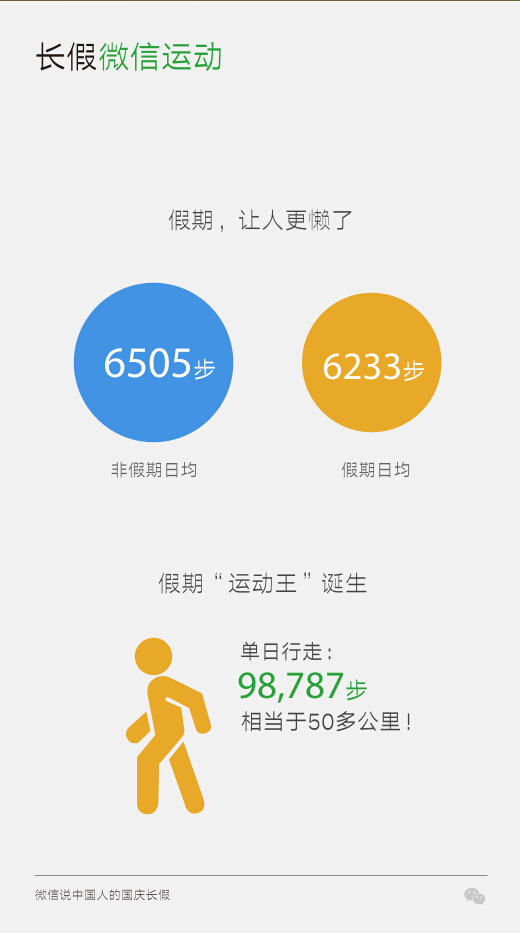 國慶長假對于很多人也是個刷微信運動的好時候。不過和非假期相比,假期的平均步數(shù)實際上減少了約200步。但是,有用戶在一天之內(nèi)走的步數(shù)達9.8萬步,如果按每小時走6000步算,相當(dāng)于該用戶馬不停蹄走了16個小時。