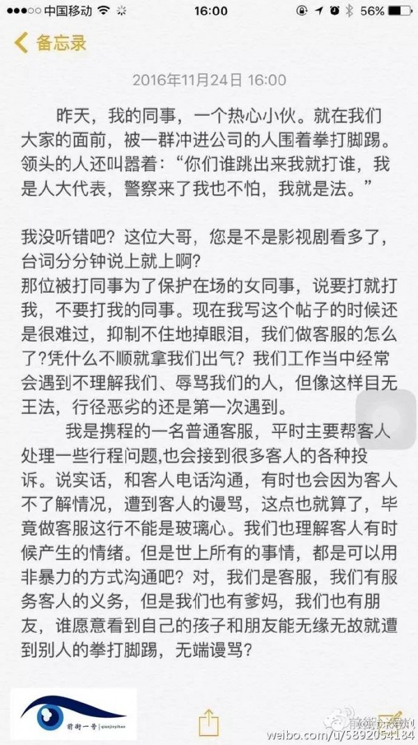上周六,沈某帶著11個(gè)人來(lái)到攜程公司辱罵客服,稱(chēng)攜程欺詐,索要退一賠一的補(bǔ)償,共計(jì)近11萬(wàn)元。