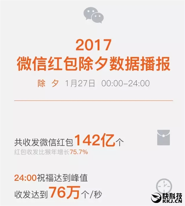 據(jù)微信官方數(shù)據(jù),1月27日除夕全天,微信紅包共收發(fā)多達(dá)142億個(gè),比猴年除夕猛增了75.7%。