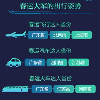 通過分析跨省返鄉(xiāng)比例,高德地圖得出了春運(yùn)鄉(xiāng)愁最濃的省份,分別是江西省、廣西壯族自治州和湖南省。而除夕仍然有不少人奔波在回家路上的省份則是安徽省、河南省和河北省,可見是再晚也要回家。從春運(yùn)大軍的出行方式來看,廣東省由于人口流動(dòng)最大,乘坐飛機(jī)、汽車、火車的人數(shù)均最多。