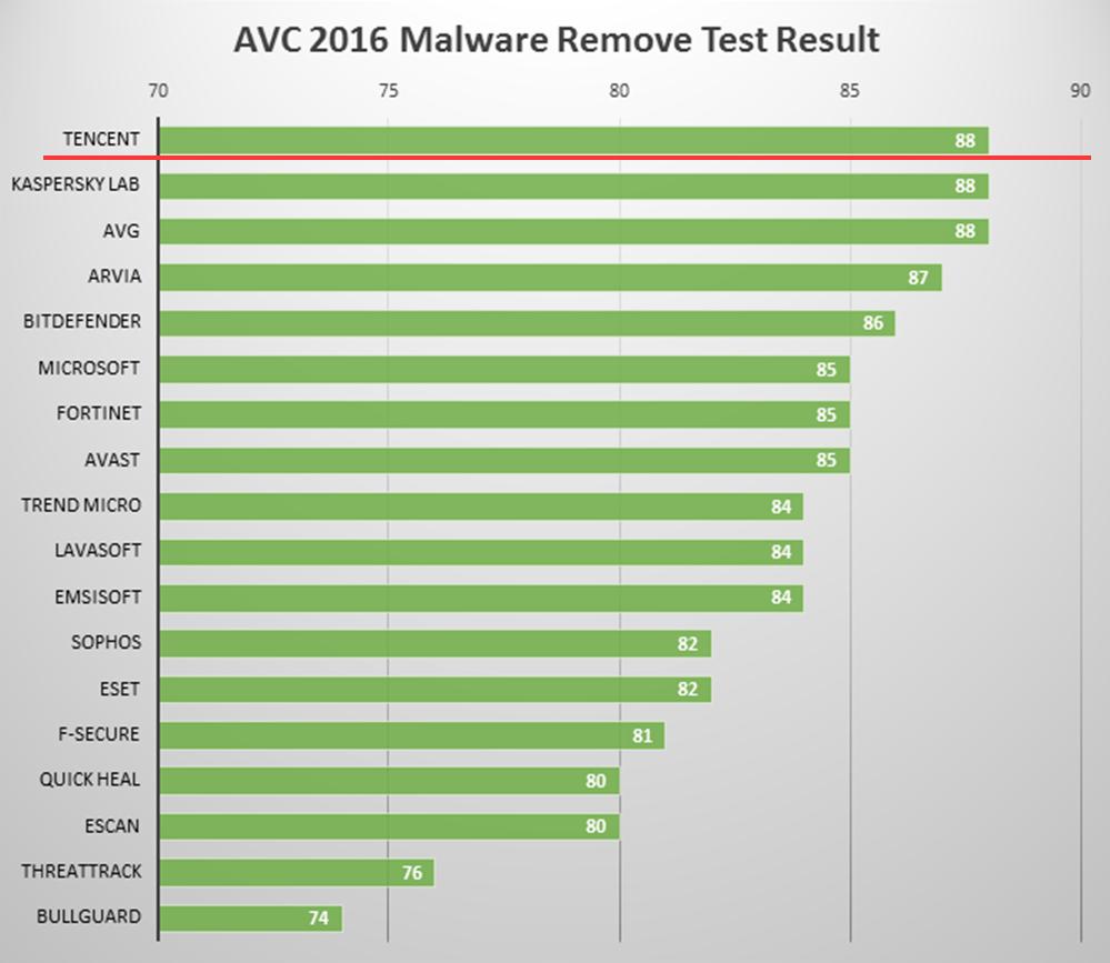 同時(shí),值得一提的是,清除測(cè)試系騰訊電腦管家(英文版)2016年首次參測(cè)的項(xiàng)目,在和卡巴斯基、AVG等國(guó)際知名殺軟的同場(chǎng)競(jìng)技中,騰訊電腦管家(英文版)憑借自研殺毒引擎TAV,以出色的清除能力取得最高分,與卡巴斯基、AVG并列排名世界第一,榮獲“A+”最高評(píng)級(jí)。觀察清除測(cè)試結(jié)果還可以發(fā)現(xiàn),在18款參測(cè)的殺毒軟件中,騰訊電腦管家是唯一一個(gè)登榜的國(guó)產(chǎn)殺軟品牌,這代表著國(guó)產(chǎn)殺軟在惡意文件清除能力上已經(jīng)到達(dá)了世界領(lǐng)先水平。
