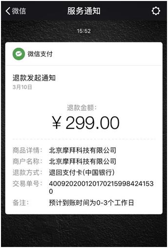 10日,針對用戶和媒體質(zhì)疑,中新經(jīng)緯客戶端(微信公眾號:jwview)獨(dú)家向摩拜單車方面進(jìn)行了求證,涉及退款難、客服忙、人身保險等問題。其中,就押金退款難問題,摩拜方面表示,目前用戶押金已經(jīng)可以實(shí)現(xiàn)秒退,設(shè)置2到7天是根據(jù)微信和支付寶等付款通道提現(xiàn)時間。中新經(jīng)緯客戶端(微信公眾號:jwview)親測發(fā)現(xiàn),點(diǎn)擊“押金退款”的確瞬間退款成功。押金額按照原付款通道微信支付-信用卡返回,但仍需0到3個工作日。