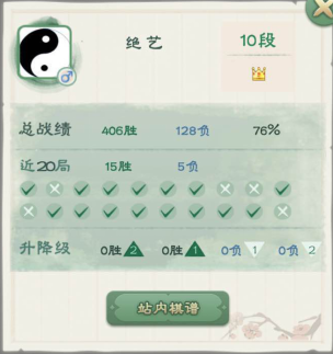 “絕藝”名字,源自唐代杜牧的送別詩“絕藝如君天下少,閑人似我世間無”。“絕藝”曾先后使用多個ID,在騰訊圍棋(野狐圍棋)平臺與業(yè)余和職業(yè)高手切磋,多次戰(zhàn)勝中日韓三國一眾頂尖棋手,成為騰訊圍棋首個晉級“十段”的棋手。截至3月9日,“絕藝”對局數(shù)量達534盤,戰(zhàn)績是406勝128負,勝率76%,與柯潔、古力、常昊、范蘊若、范廷鈺、樸廷桓等超過100位知名人類棋手有過交鋒。