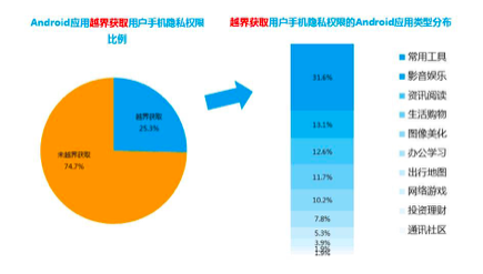 用戶(hù)更需警惕的是,25.3%的android應(yīng)用存在越界獲取用戶(hù)手機(jī)隱私權(quán)限的情況。