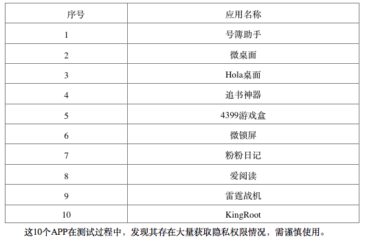 報(bào)告還給出了一份包括 10個(gè)應(yīng)用的隱私安全灰名單,分別是號(hào)簿助手、微桌面、Hola桌面、追書(shū)神器、4399游戲盒、微鎖屏、粉粉日記、愛(ài)閱讀、雷霆戰(zhàn)機(jī)、KingRoot。