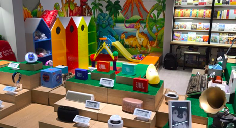 8月6日,京東之家北京通州萬達(dá)廣場店開業(yè),200平米的店面內(nèi)一上午就涌進(jìn)近了2000人。顧客進(jìn)店可以“刷臉”成為會員,了解到諸如“高冷天蝎”、“夜貓子”等針對自己偏好的趣味分析。復(fù)古的貓王收音機、炫酷的全面屏手機、叮咚智能音箱、極米的家用投影儀……不少精心陳列的商品讓顧客愛不釋手。店里還有圖書角、兒童游樂區(qū)供人放松休憩,老人則可以體驗眼部或肩背按摩器的功效。