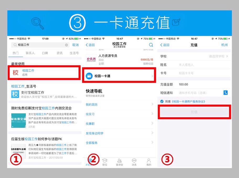 步驟:支付寶首頁搜索-校園工作-一卡通充值