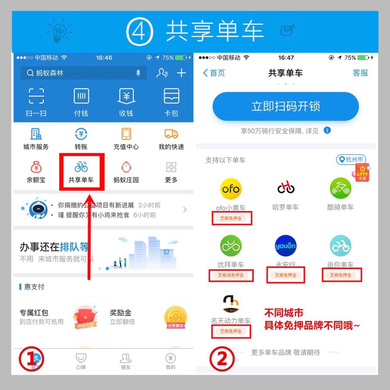 入學(xué)后的第一個(gè)國慶轉(zhuǎn)眼就來,很多新生會選擇騎共享單車熟悉新城市。市面上的共享單車押金從99元、199元、299元不等,但用支付寶掃碼,很多共享單車都可以免押金騎行,又能給自己省下幾天生活費(fèi)了。