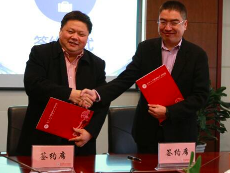 復(fù)旦大學(xué)附屬婦產(chǎn)科醫(yī)院院長(zhǎng)徐叢劍(左)和騰訊互聯(lián)網(wǎng)+副總裁張。ㄓ遥┖炇鸷献鲄f(xié)議