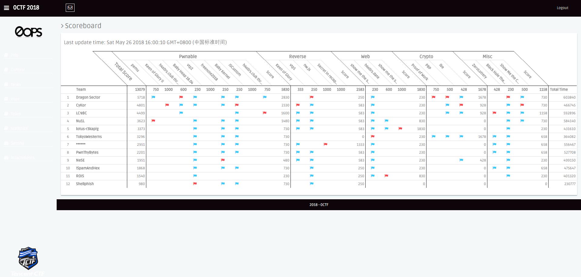 5月26日決勝之日,各大戰(zhàn)隊(duì)之間的較量進(jìn)入白熱化。面對(duì)韓國CyKor戰(zhàn)隊(duì)在首日的“霸榜”表現(xiàn),波蘭Dragon Sector戰(zhàn)隊(duì)奮起直追,不斷縮小與CyKor戰(zhàn)隊(duì)的分差,并在11:35成功反超,首次出現(xiàn)在得分榜首位。隨后兩支戰(zhàn)隊(duì)的競(jìng)爭(zhēng)進(jìn)入高潮,交替爭(zhēng)奪榜首位,在比賽的最后兩小時(shí)形成拉鋸戰(zhàn)。最終,波蘭Dragon Sector戰(zhàn)隊(duì)?wèi){借917分的大比分領(lǐng)先,以總分5718分?jǐn)孬@TCTF 2018國際賽冠軍,韓國CyKor戰(zhàn)隊(duì)和俄羅斯LCBC戰(zhàn)隊(duì)以總分4801、4499分獲亞軍、季軍。