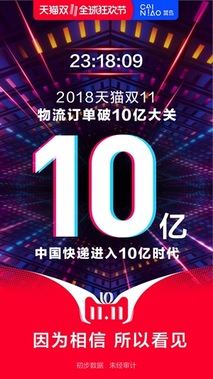 11月11日23點18分09秒,2018天貓雙11當(dāng)日物流訂單量突破10億大關(guān),十年來強勁增長3800多倍。這是一個歷史性的跨越,宣告中國快遞進(jìn)入一天10億的新時代,顯現(xiàn)出中國商業(yè)的巨大活力和強勁消費信心。