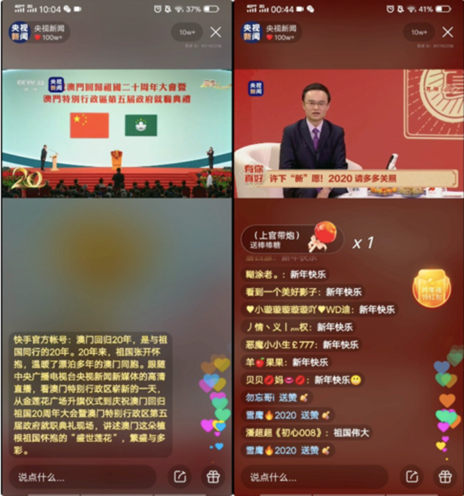 在澳門回歸祖國20周年之際,快手聯(lián)合央視新聞進行了6場系列直播,累計觀看人次超過4000萬;跨年夜,央視新聞推出“有你真好”特別節(jié)目,在快手號全程同步直播,直播答題互動形式也首次出現(xiàn)在央視跨年特別節(jié)目中,累計觀看人數(shù)1.4億。