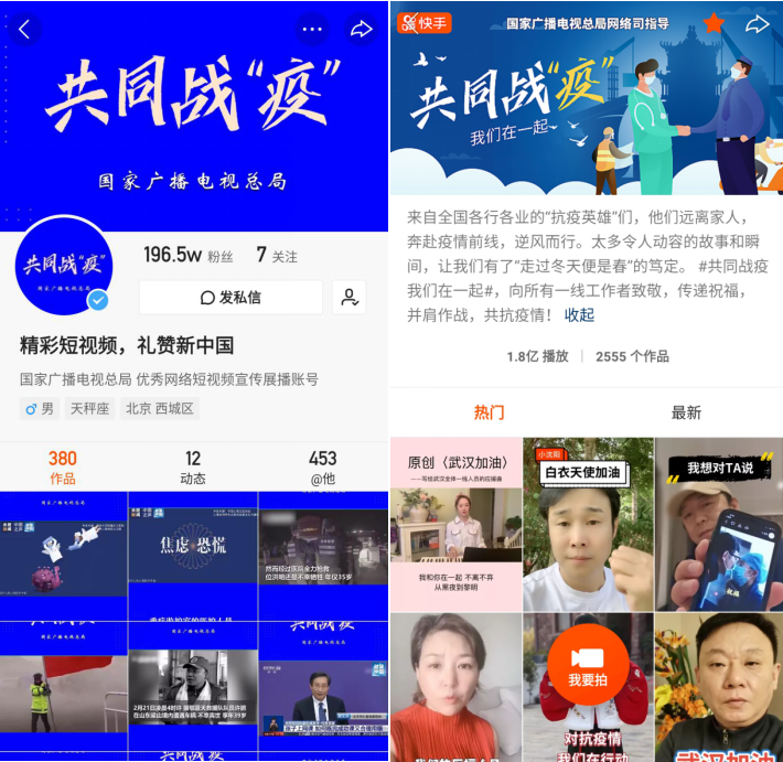 疫情當前,多一份對疫情的了解,就會多一份安全保障。2019年9月,廣電總局在快手開通了優(yōu)秀網(wǎng)絡(luò)短視頻宣傳展播賬號,目前粉絲達196萬。快手在打好自身的疫情防控狙擊戰(zhàn)的同時,主動承擔社會責任,在廣電總局的統(tǒng)籌下,開展了“共同戰(zhàn)‘疫’”視頻宣傳活動,重點資源位突出推薦,積極發(fā)揮快手平臺的流量、技術(shù)和資金優(yōu)勢,全力傳播全國人民守望互助的正能量內(nèi)容,及時傳遞疫情的準確信息,普及科學防護權(quán)威信息,累計發(fā)布疫情防控短視頻200余條,播放量近5億次。