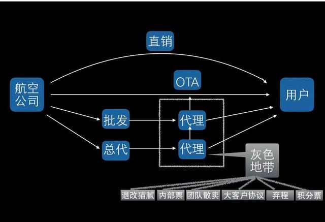 在航空公司與用戶之前,機票銷售用多種方式:直銷、OTA、平臺以及代理。在航空公司銷售機票的過程中,機票代理占據(jù)了重要位置。