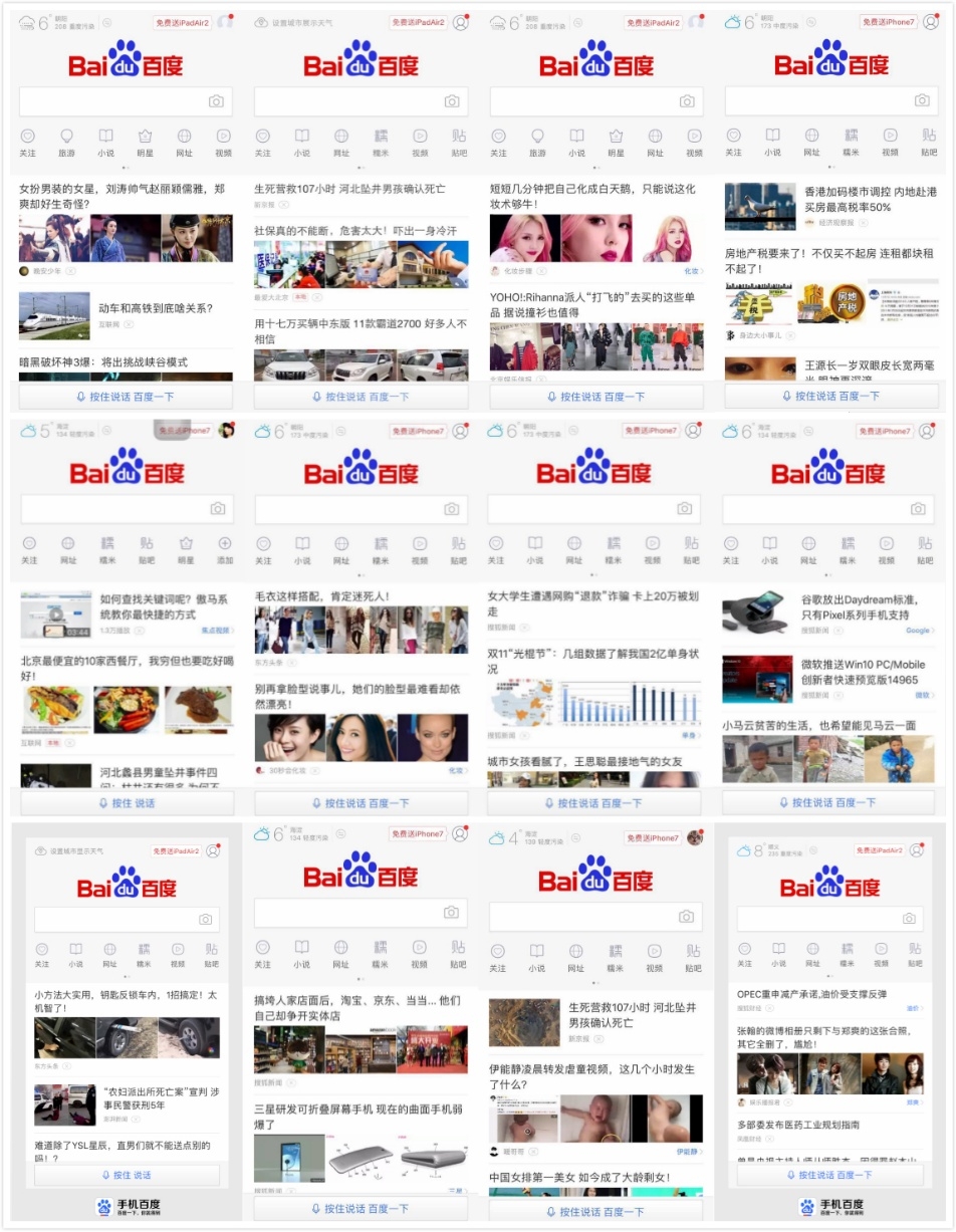 歷時三個小時,三路記者累計收集了309張路人的手機百度資訊流截圖,從截圖來看,記者確實找不到完全相同的兩個手機百度資訊流。但是當(dāng)記者進行了一番數(shù)據(jù)統(tǒng)計之后,也發(fā)現(xiàn)了一些有趣的共性和更多的個性。