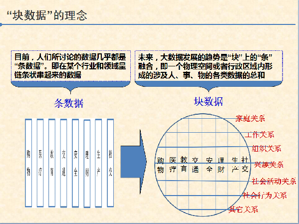 與之相比,塊數(shù)據(jù)是在一個物理空間或者行政區(qū)域形成的涉及到人、事、物等各類數(shù)據(jù)的綜合,相當于將各類“條數(shù)據(jù)”解構(gòu)、交叉、融合。在塊數(shù)據(jù)集合過程中,包含了數(shù)據(jù)空間的填充、空間數(shù)據(jù)的重構(gòu)、集合過程的組構(gòu),及組構(gòu)過程中的集合,同時還有新數(shù)據(jù)的匯集和原有數(shù)據(jù)組合后的衍生數(shù)據(jù)。塊數(shù)據(jù)概念的提出和應用,使我們對大數(shù)據(jù)的挖掘?qū)崿F(xiàn)了從混沌到精準。