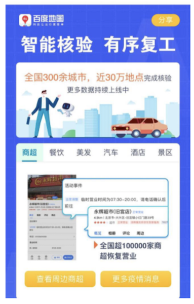 隨著疫情防控形勢好轉(zhuǎn),各地有序復(fù)工,百度地圖推出了復(fù)工地圖,通過AI智能外呼系統(tǒng)完成對全國300余城市近30萬地點(diǎn)的核驗(yàn),在地圖中及時更新商場、超市、餐飲等民生場所營業(yè)狀態(tài)和最新營業(yè)時間。除此之外,接入京東到家、美團(tuán)外賣等小程序、上線醫(yī)院急診床位擁擠等級等一系列豐富多元的POI數(shù)據(jù)信息,全面幫助用戶在疫情期間及時準(zhǔn)確的了解地點(diǎn)信息,輔助做好防疫工作。