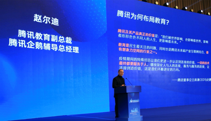 在峰會主論壇,趙爾迪發(fā)表《科技向善:技術(shù)推動智慧教育升級》主題演講,系統(tǒng)介紹了騰訊教育成立的背景、目標、業(yè)務(wù)、智慧教育解決方案、平臺能力和教育成果。據(jù)他介紹,科技向善是騰訊的企業(yè)使命愿景,通過技術(shù)推動在線教育智慧化是騰訊努力的方向。