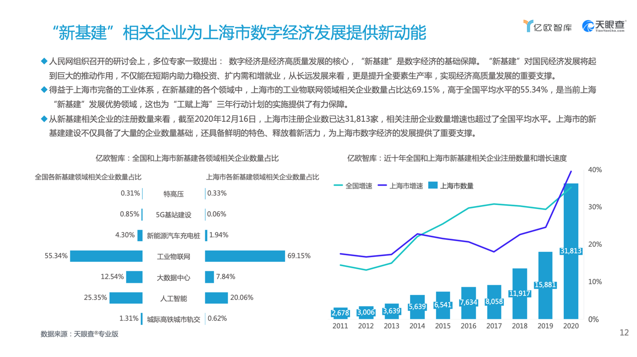 從新基建相關(guān)企業(yè)的注冊數(shù)量來看,截至2020年12月16日,上海注冊企業(yè)數(shù)已達31,813家,相關(guān)注冊企業(yè)數(shù)量增速也超過全國平均水平。上海新基建建設(shè)不僅具備了大量的企業(yè)數(shù)量基礎(chǔ),還具備鮮明特色、釋放新活力,為上海數(shù)字經(jīng)濟發(fā)展提供了重要支撐。