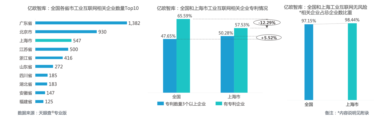 工業(yè)互聯(lián)網(wǎng),是第二產(chǎn)業(yè)數(shù)字化代表行業(yè)。據(jù)天眼查數(shù)據(jù)顯示,上海市工業(yè)互聯(lián)網(wǎng)相關(guān)企業(yè)547家,位居全國第三,擁有3個及以上專利企業(yè)占比50.28%,高于全國水平;無風(fēng)險企業(yè)占比98.44%,基本和全國持平,行業(yè)整體呈低風(fēng)險狀態(tài)。
