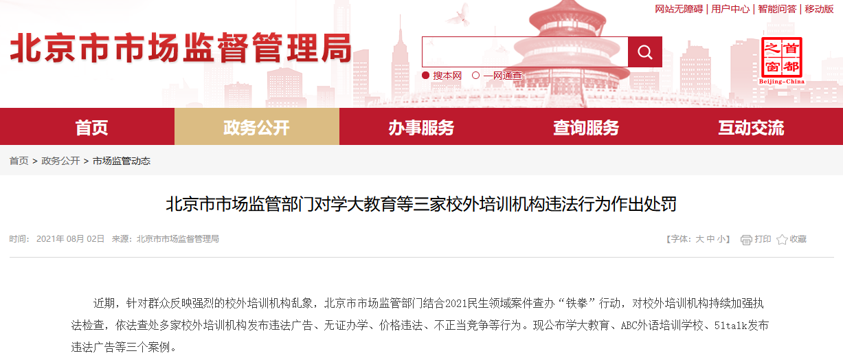 北京市市場監(jiān)督管理局稱,近期,針對群眾反映強烈的校外培訓機構亂象,北京市市場監(jiān)管部門結合2021民生領域案件查辦“鐵拳”行動,對校外培訓機構持續(xù)加強執(zhí)法檢查,依法查處多家校外培訓機構發(fā)布違法廣告、無證辦學、價格違法、不正當競爭等行為,F(xiàn)公布學大教育、ABC外語培訓學校、51talk發(fā)布違法廣告等三個案例。