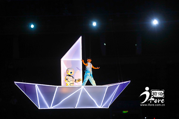 7月底,潘天順正式進組訓(xùn)練,每天訓(xùn)練七八個小時,從那時起他有了一個新的稱呼——“津娃”,很多熟悉他的工作人員甚至不知道他的名字,漸漸地他也就習(xí)慣了人們這么叫他。開幕式中“津娃”第一次出場需要吊威亞,聽說要吊威亞潘天順興奮不已,直到真的被游絲吊在15米的空中左搖右晃嚇得哇哇大叫的時候,他才知道沒那么簡單。威亞訓(xùn)練讓潘天順記憶猶新,吊威亞的游絲很軟,他不僅要在威亞上掌握平衡避免左右擺動,還要完成導(dǎo)演要求的指定動作。他每次要在威亞上呆30到40分鐘,每天四五個小時被吊在高空,胯部和腰部經(jīng)常被威亞裝備勒出淤青。潘天順的指導(dǎo)老師魏珊珊告訴“津云”-前沿新聞記者,不管多苦、多累,他從來都不抱怨,每次都是老師主動問他,是不是累了,是不是需要休息。