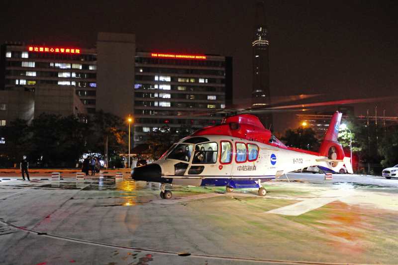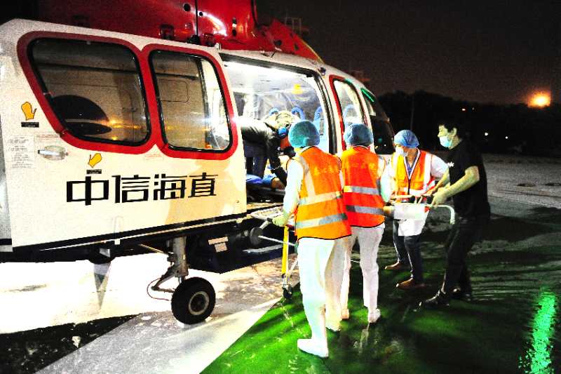 北大醫(yī)療海洋石油醫(yī)院立即啟動應急預案,將患者心電圖、搶救用藥信息通過泰心互聯(lián)網(wǎng)醫(yī)院系統(tǒng)傳到泰心醫(yī)院胸痛中心,并決定啟動直升機救援,由海上平臺醫(yī)生護送患者前往泰心醫(yī)院胸痛中心。中信海洋直升機股份有限公司相關部門迅速進行準備,申請空域、準備飛機、研究航線及天氣。同時,泰心醫(yī)院迅速啟動綠色通道,后勤人員迅速準備停機坪,急診醫(yī)護隨時準備接診,心內(nèi)科、超聲科、介入中心工作人員也嚴陣以待;飛機于23點21分升空,前往平臺救援!9日00點13分抵達海上平臺。00點20分飛機在平臺起飛,載著患者飛越112海里(200多公里),于1點10分抵達泰心醫(yī)院停機坪。