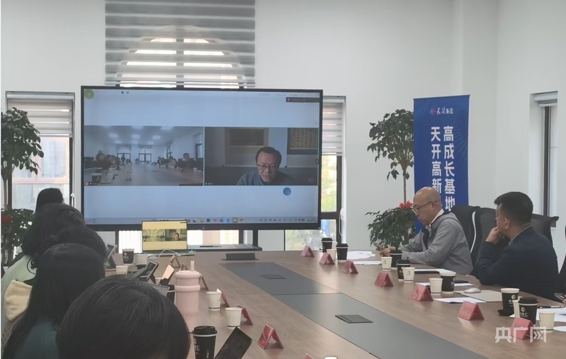 清華大學(xué)講席教授朱剛(視頻畫面右一)通過視頻連線介紹項(xiàng)目情況(央廣網(wǎng)見習(xí)記者 楊輝 攝)