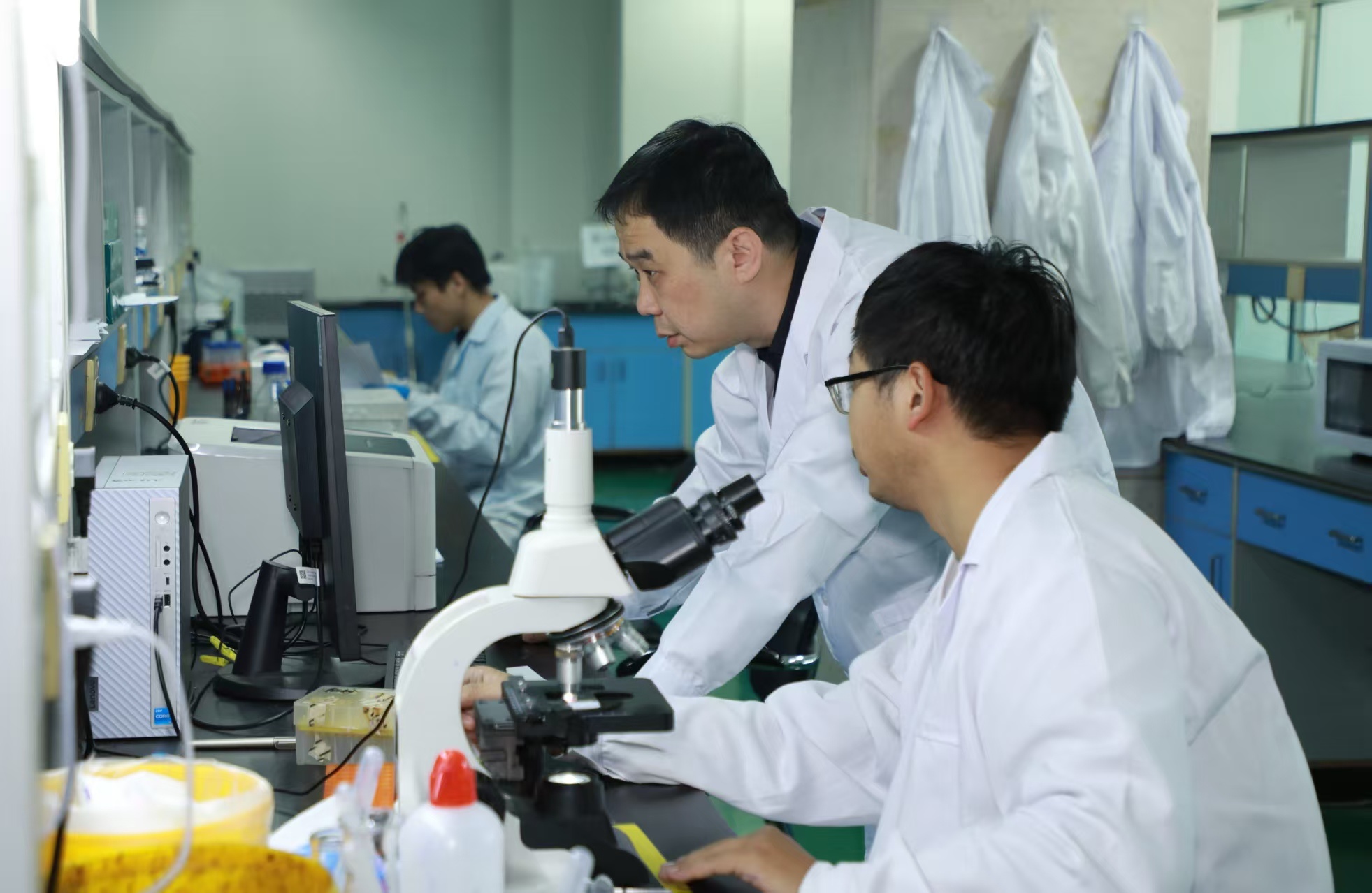 天津合生生物科技有限公司董事長劉斌(左二)和青年科研人員察看實(shí)驗(yàn)數(shù)據(jù)(央廣網(wǎng)發(fā) 企業(yè)供圖)