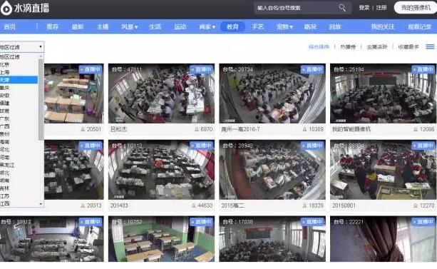 記者在網(wǎng)絡(luò)上搜索“水滴直播”,官網(wǎng)主界面最上面一欄,分為“主播、運(yùn)動、寵物、商家、教育”等多個直播選項(xiàng)。在“教育”一欄頁面下,依次排列著小窗口,均是學(xué)校教室內(nèi)直播畫面,點(diǎn)開后發(fā)現(xiàn),所處位置有北京、天津、上海、河南等多個區(qū)域,涉及學(xué)校包括高中、小學(xué)、幼兒園等,有注明具體的學(xué)校名稱和班級,也有以“我的智能攝像機(jī)”的名字代替。