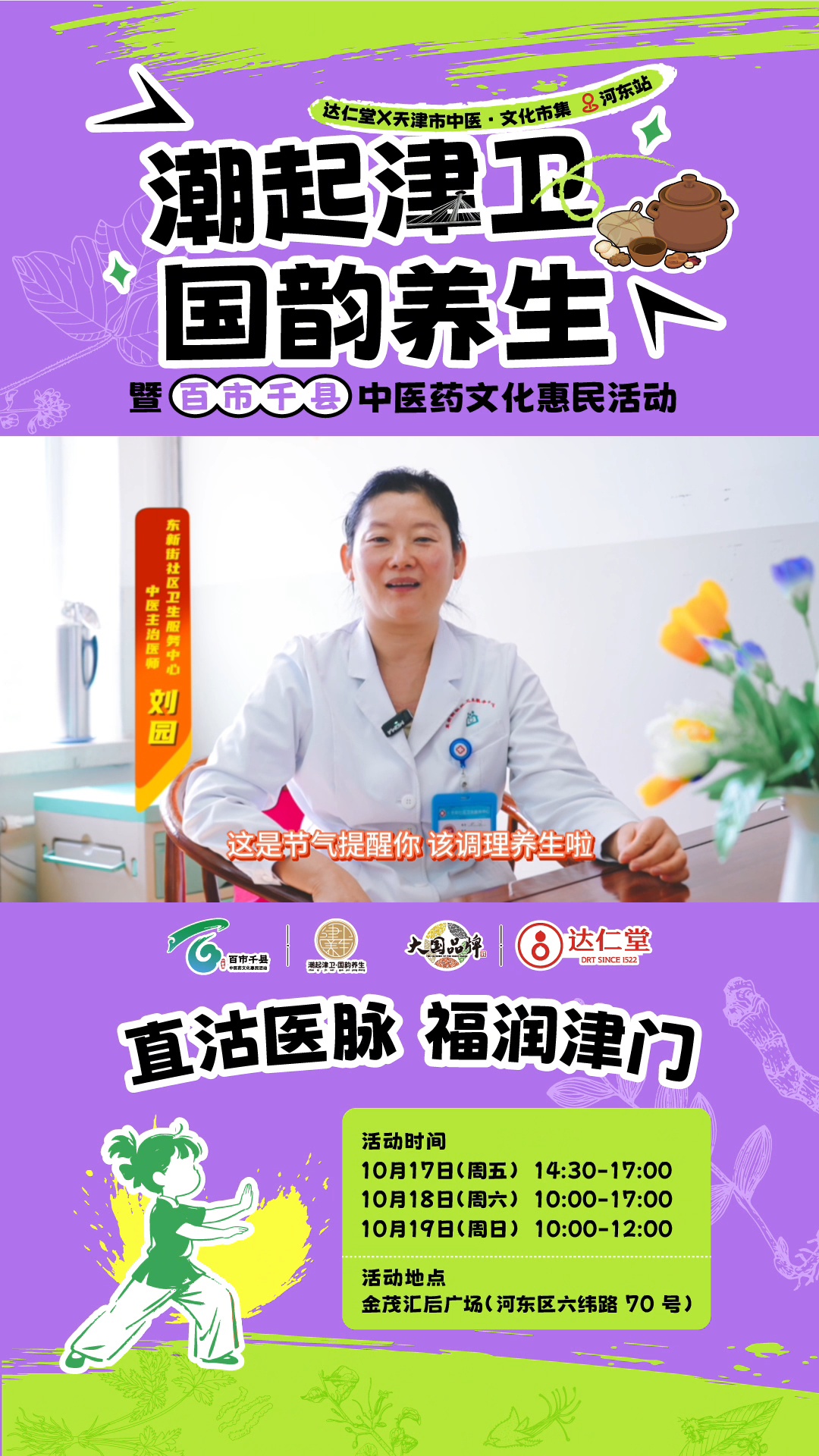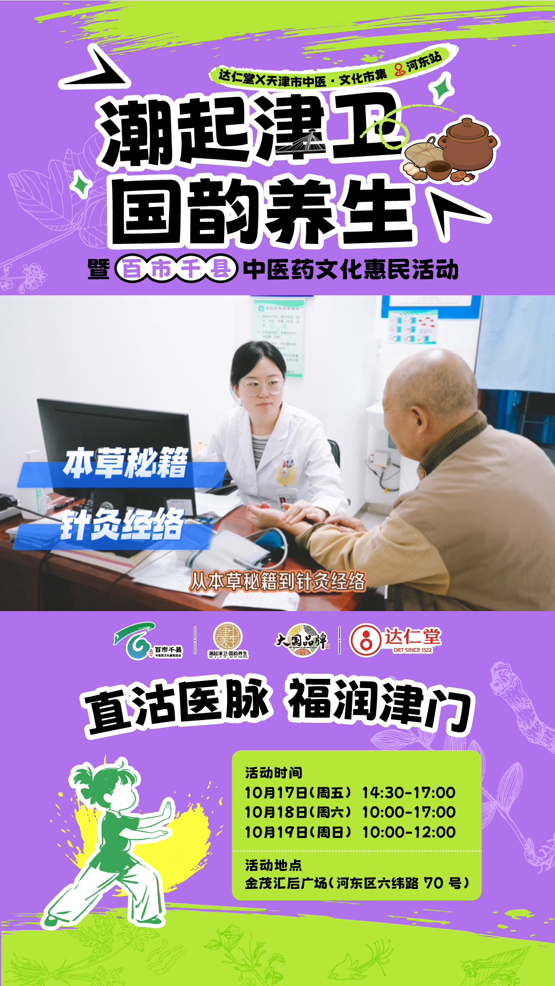 10月17日至19日,由津藥達(dá)仁堂獨(dú)家總冠名的“潮起津衛(wèi)·國(guó)韻養(yǎng)生”天津市中醫(yī)文化市集河?xùn)|站將隆重舉行。