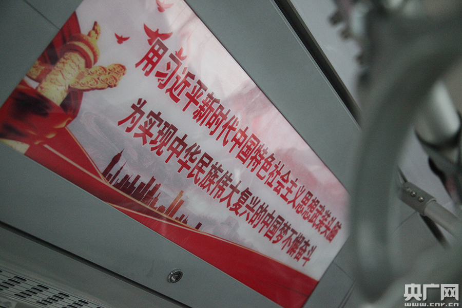 記者在該主題車(chē)廂看到,車(chē)廂外部以紅色背景為主色調(diào),車(chē)身印有“高舉習(xí)近平新時(shí)代中國(guó)特色社會(huì)主義思想偉大旗幟”“構(gòu)建中國(guó)精神 中國(guó)價(jià)值 中國(guó)力量”兩條標(biāo)語(yǔ)和天安門(mén)、天壇等標(biāo)志性建筑。在車(chē)廂內(nèi)的投幣箱、駕駛艙門(mén)、座椅、后車(chē)門(mén)、風(fēng)道展板等位置都設(shè)置和十九大相關(guān)但內(nèi)容各異的宣傳畫(huà)板,共計(jì)40余處。